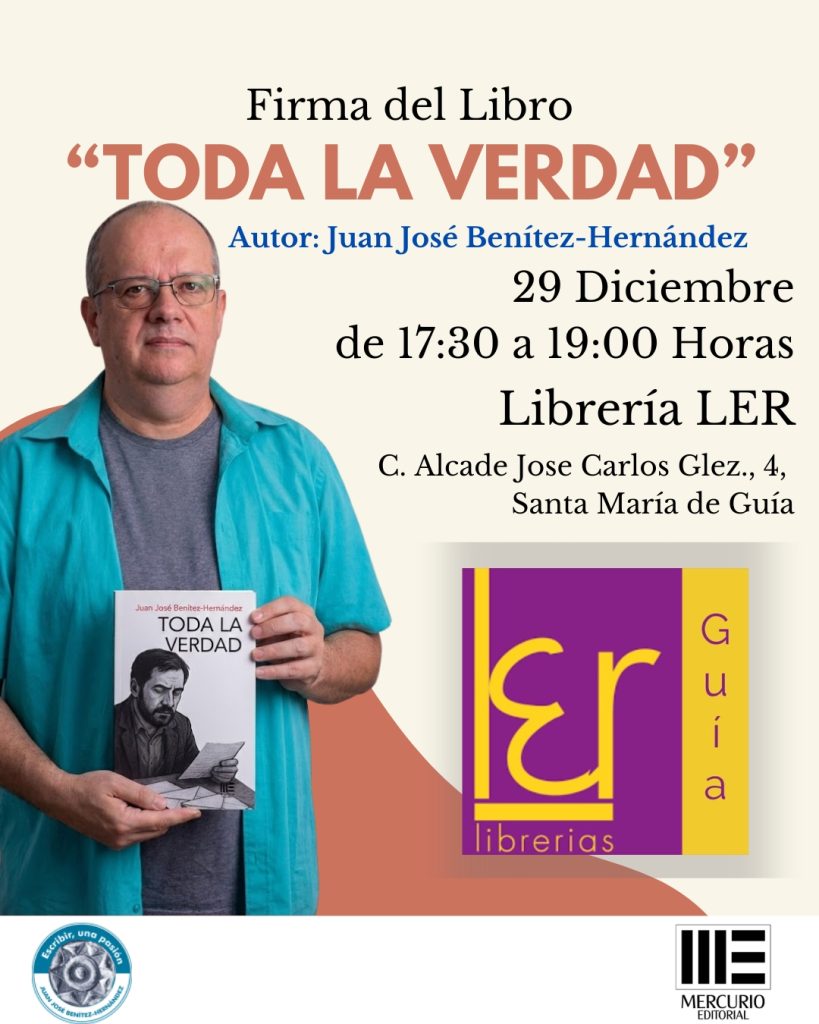 La Librería LER de Santa María de Guía se prepara para recibir este 29 de diciembre, de 17:30 a 19:00 horas, a quienes deseen acercarse al autor Juan José Benítez-Hernández, que presentará y firmará ejemplares de su más reciente obra, “Toda la verdad”.
